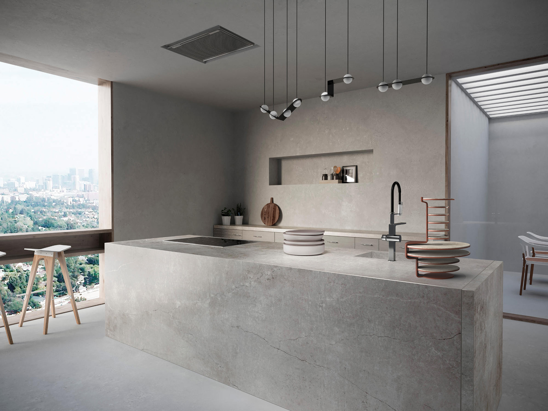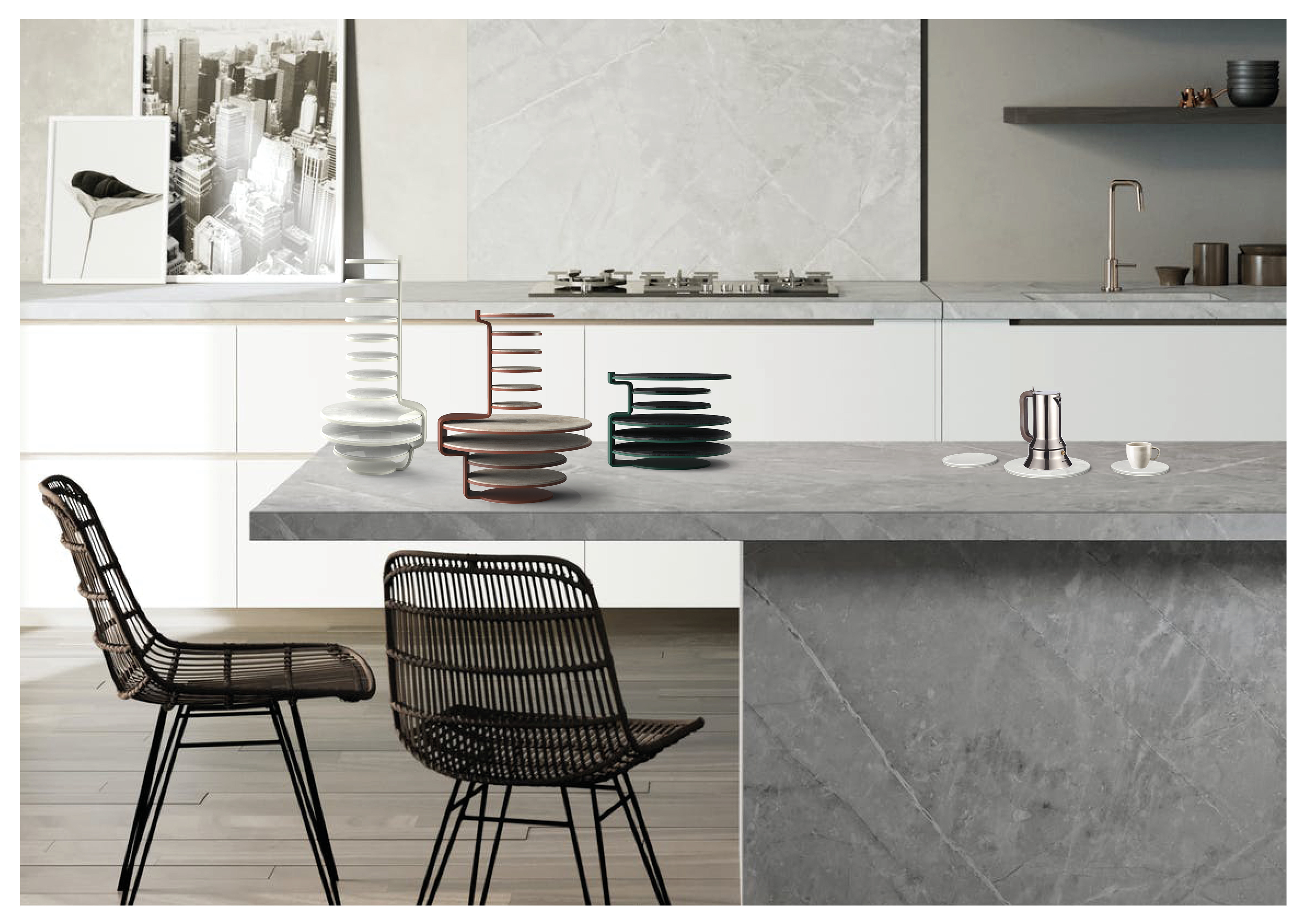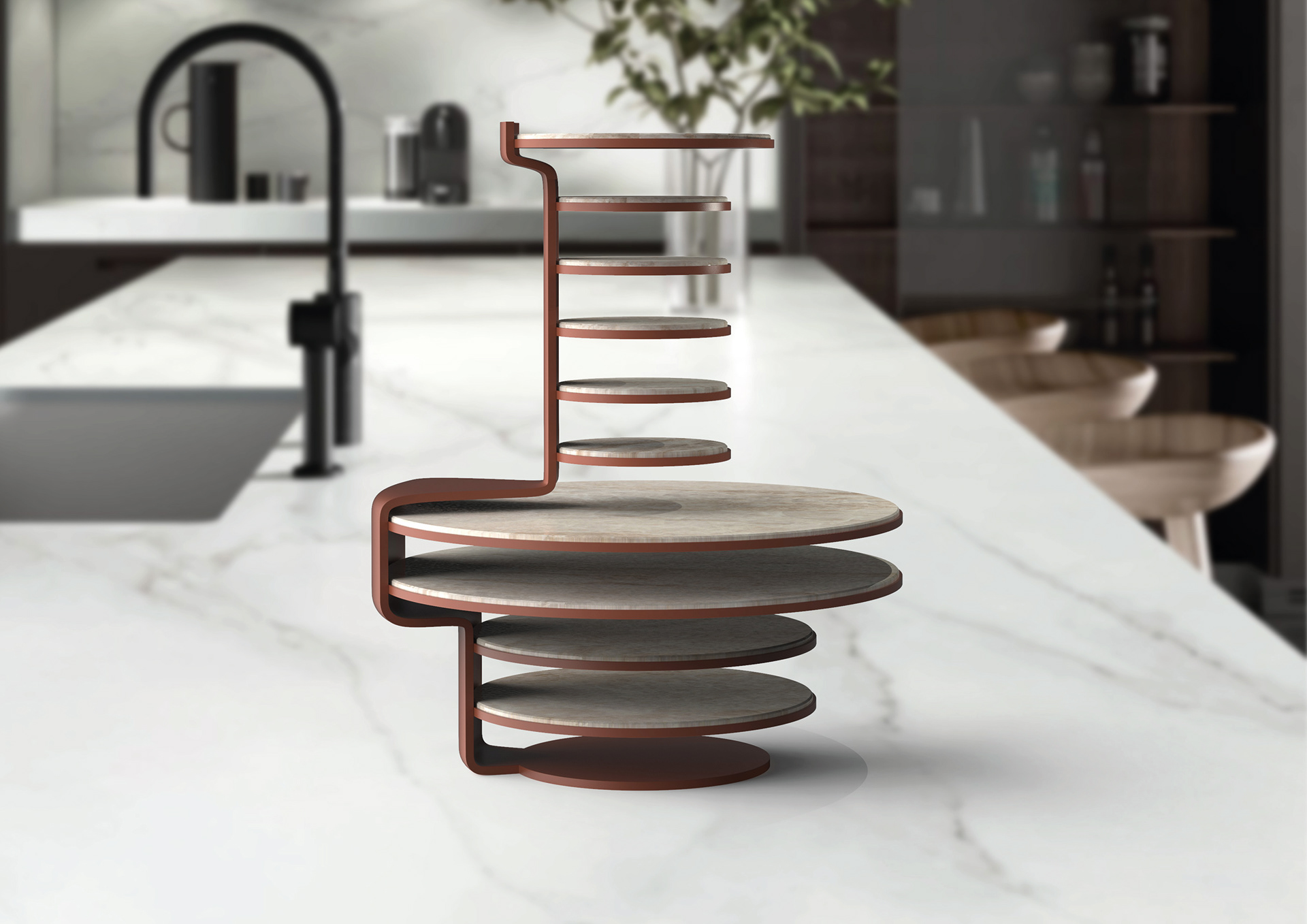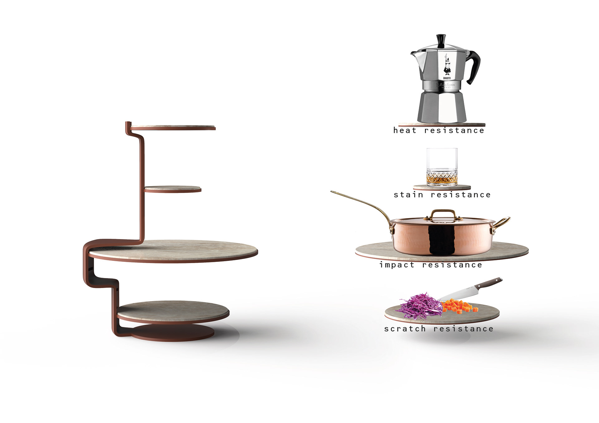 The product is composed by a base with a lateral sustain, which draws the silhouette of the object, recalling and evoking, decorative vases. The circular elements, designed to host the Dekton’ disks, completes the formal perception of the object.In relation to the different usage and the complementary objects(pans, moka, glasses, plates, kettles...) which interacts with the product, where thoughts different diameters moreover to enhance all the technical properties of the material.