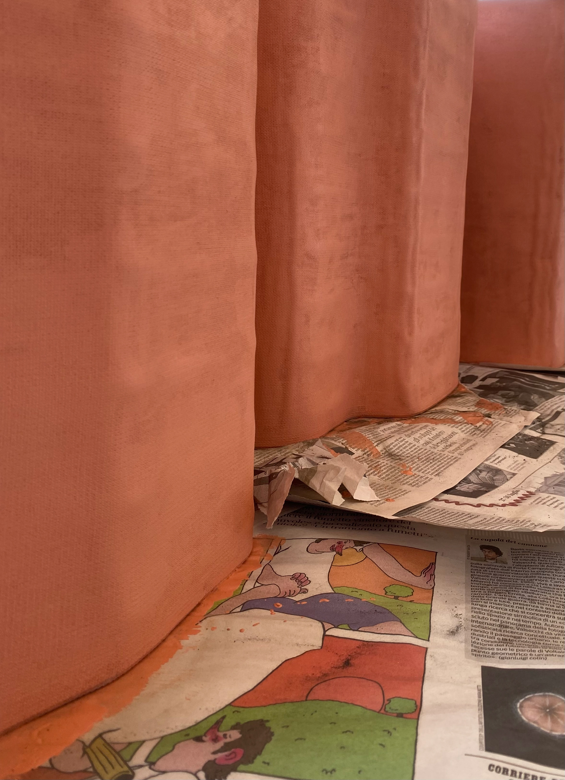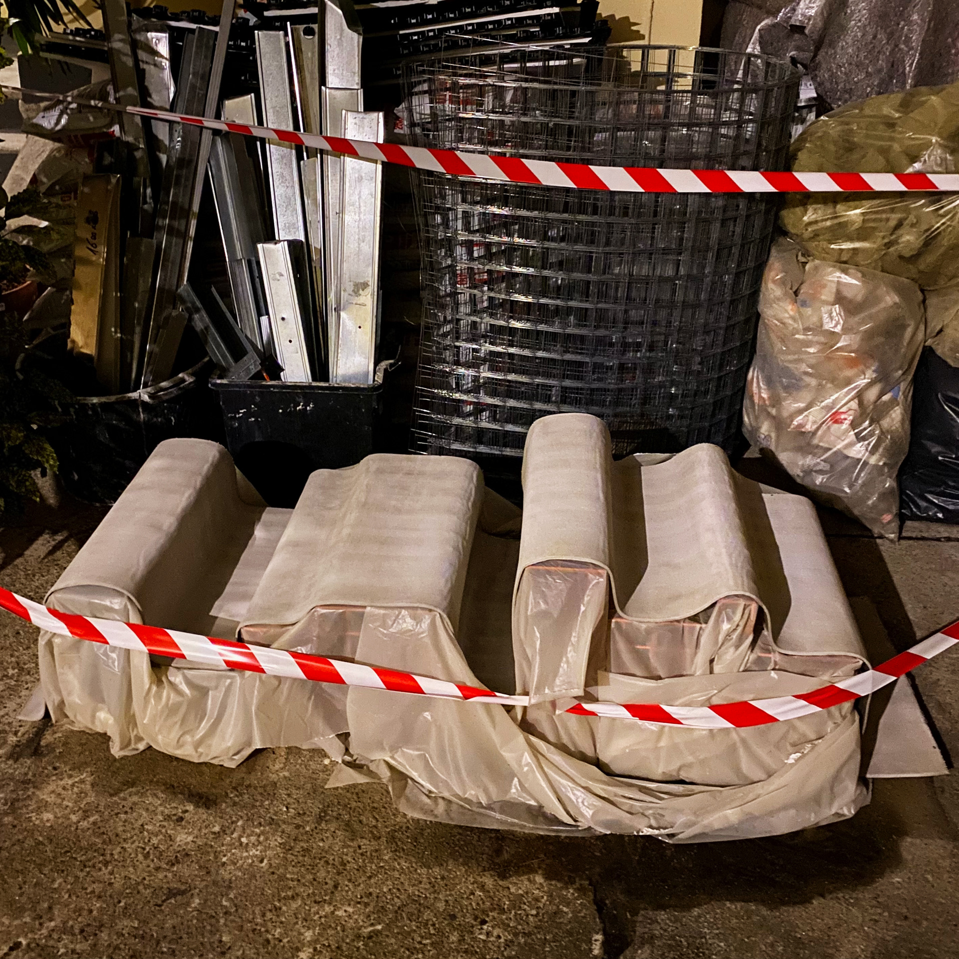 The laying surface is made of concrete canvas, a geo-textile generally used torealize irrigation canals’ beds. It presents itself with an initial malleable aspect, gaining stiffness thanks to an hydration process. The union of these materials, considered ‘waste and poor’, aims to raise a reflection and challenge the relationship between beauty and trash, functionality and waste, affordability, spoiling material and design democracy.